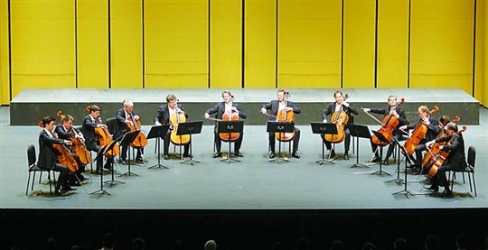 柏林愛樂十二把大提琴為觀眾奉上大衛·馮克《組曲》。 本報記者 蔣迪雯 攝