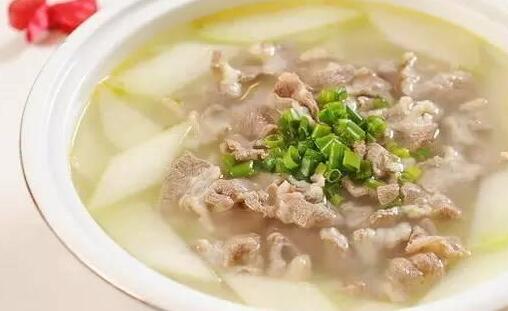 材料:冬瓜250克,羊肉200克,香菜25克。香油1小勺,精鹽12小勺,胡椒粉、味精各13小勺,蔥、姜塊少許。