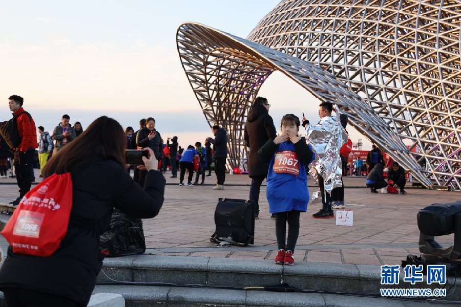 1月1日7:04,近3000名參賽選手和市民抵達南匯嘴觀海公園最佳觀景位置,共同在司南魚下向2020年第一輪太陽問好。新華網史依靈 攝