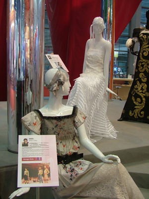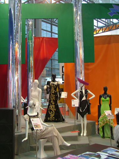 在1號交易項目館內,記者發現182平方米的澳門館給人以熱情奔放的感覺——中心位置搭建的階梯型舞臺周邊配以圓柱圍繞,上方搭配大面積的彩色幾何圖形,顏色鮮艷醒目,周邊不設展板。但在展區內卻展出了具有澳門風格的一些女裝,這些女裝設計得具有葡式風格,十分搶眼。特別與眾不同的是,這些女裝一律挂出了非賣品的標識。 [