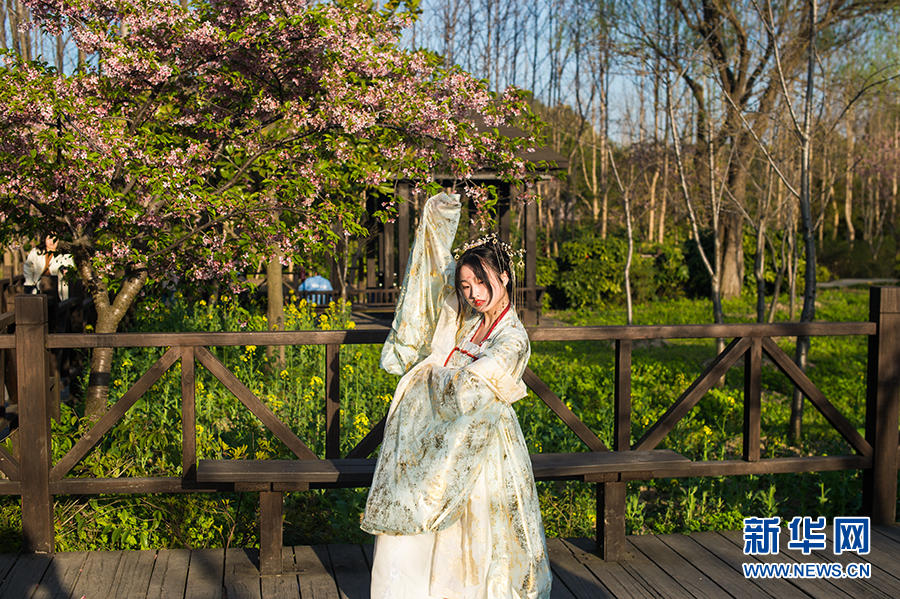 圖為一些遊客穿著漢服與櫻花留影。新華網吳愷 攝