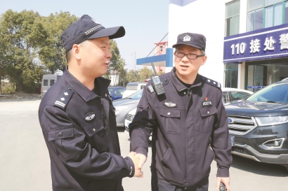 金澤派出所教導員陳海君(右)走訪江蘇吳江區汾湖派出所,和吳江區汾湖派出所教導員錢曉忠一起商談警務協作。