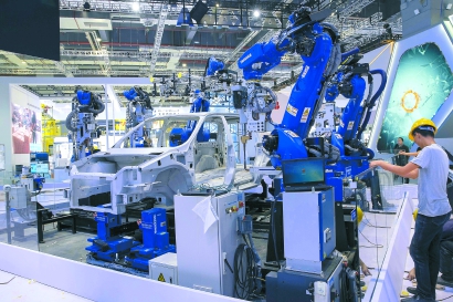 昨天,工作人員在調試汽車工業機器人。 記者 賴鑫琳 攝