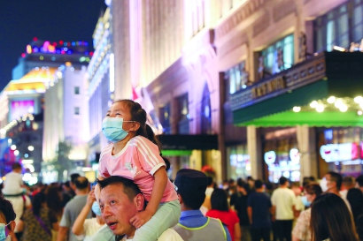 南京路步行街流光溢彩,旅遊節期間吸引不少遊客觀光攝影。圖/東方IC