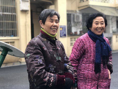 林玉珍、余愛琴老人笑談老舊小區改造後的變化。(余平 攝)