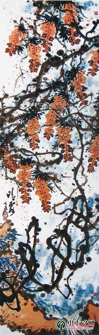 “折釵股”、“屋漏痕”線條用筆是歷代書畫家為之殫精竭慮、孜孜以求的境界,然真正得其奧妙筆法的如鳳毛麟角。如“屋漏痕”筆法,沒有深厚的功力和技巧是難以掌握的,“屋漏痕”筆法只記于史書上,今人未曾見過這種鮮明的筆法。這種高深的筆法只有在吳昌碩的筆法中略有顯示,就讓吳的筆法達到了一定的藝術高度;“折釵股”筆法在潘天壽用筆中鮮明地顯示,而“屋漏痕”在他的指畫中亦多有運用,就使其線條筆法達到了驚人的高度。