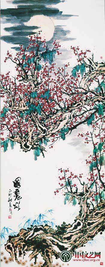 蘇東天上世紀八十年代作品“折釵股”筆法運用得較多,至八十年代末期“屋漏痕”筆法在作品中時有輕微顯現,如《報春》《新春》《花好月圓》《江南春》等,至九十年代初“屋漏痕”筆法開始初步明顯出現和逐漸形成,如《寫林和靖詩意》《朱梅》《疏影橫斜》等作品可見端倪,並開始形成自家線條筆法的獨特藝術風貌,九十年代末期“屋漏痕”筆法已趨于成熟,如《晴霞》《騰蛟》《鬧春》《春色》《鐵骨寒香》《老梅新花》等等,這一時期“屋漏痕”、“折釵股”筆法已是渾然交相運用,至新世紀則趨于爐火純青之境。