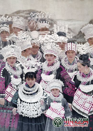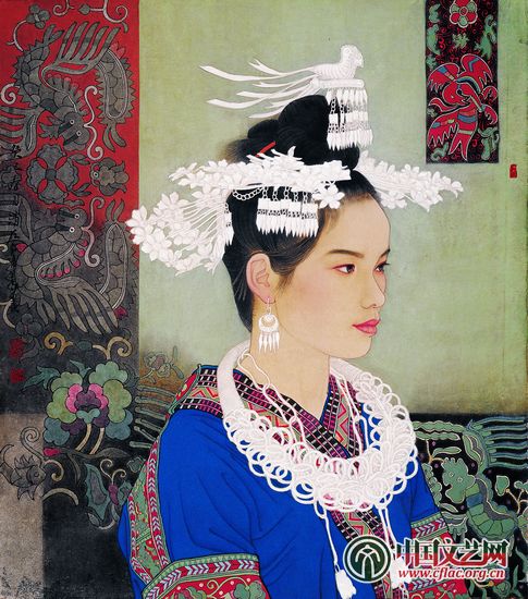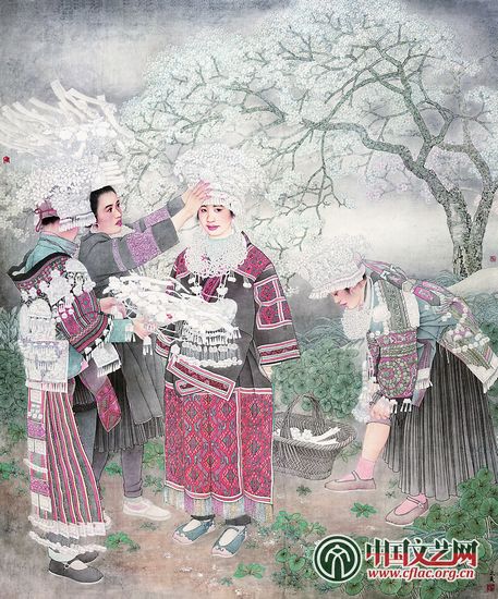 從《苗女》《二月花》再到《滿樹繁華》《清水麗人》,劉泉義一次次以恢弘厚重的畫面和眾多純情的苗家少女的人物組合,展示了苗族這個傳説中上古蚩尤部落的後裔,展示了這個民族在當代文明的觀照中禮儀猶存、民風質樸的傳統。他的作品有一種歷史的追溯感和宏大的敘事力量,在那些華麗的民族服飾背後,他凸顯了一個民族的人文精神,是一幀以盛裝苗女為民族符號的民俗肖像。這種民俗肖像的刻畫,毫無疑問,曾受到許多歐洲經典油畫的影響,油畫對于肖像那樣寫實的形象塑造,也無形地促進了他工筆重彩語言的新變。