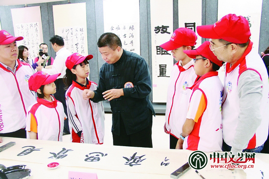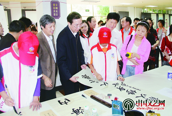 中國書協自成立以來,一直把文化為民、書法惠民作為一項重要工作內容。從2005年起,大力開展實施了“‘送歡樂下基層’中國書法進萬家”文藝志願服務工作,其中心思想就是要使廣大的書法家走出書齋,走向基層,用他們的書法藝術為人民群眾服務。