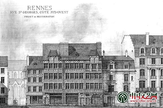 法國建築師雷蒙德·孔農1965年的作品,描繪的是在法國雷恩復建的一座磚木結構建築,其筆觸極其精確,風格高度寫實
