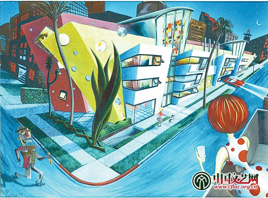 斯蒂芬·康內爾是一位美國現代派建築師,他的這幅水粉畫描繪的是洛杉磯的哈佛大學公寓,作于一九八九年,其加州流行風格可見一斑