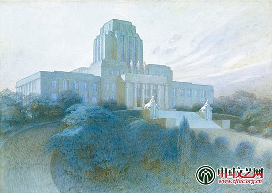 芬蘭建築師伊裏爾·沙裏寧1908年為赫爾辛基議會大廈創作的設計圖,使用了鋼筆、水粉和水彩,這件作品被人們認為是他的巔峰之作,卻未曾付諸施工