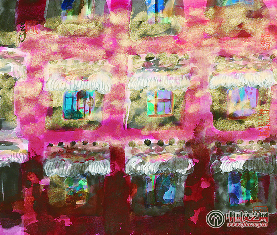 畫家王秋童癡迷于香港中環、銅鑼灣一帶那高樓林立的現代化大都市街景的印象捕捉,他在水墨這種軟化的不確定性的媒介中表現玲瓏剔透、壯麗華彩的玻璃與鋼的建築,既用水破墨撞色,表現水、墨、色的自然滲化之趣,又通過其他溶劑媒介的凝固性塑造建築的體量。據香港藝術館總館長鄧海超評論,畫家何百裏擅長以色墨潑染技法描繪山水,尤其注重光影變化,營造山川雲煙霧靄的境界,用筆雄渾厚重;他並沒有刻意經營山水的有機性層次和肌理,而是以較為抽象化的形式和筆墨表達畫境,將傳統山水蛻變成當代語境。