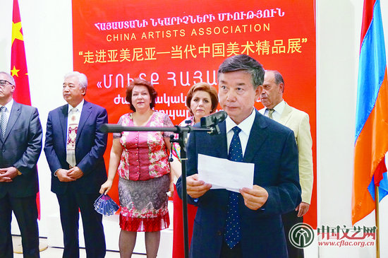 吳長江在開幕式上致辭(後排從左至右依次為:中國駐亞美尼亞大使田長春、亞美尼亞議會副議長納格達良、亞美尼亞文化部部長亞瑟·波戈相、亞美尼亞藝術家之家主席阿哈米揚)