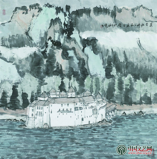 萊芒湖畔之西庸古堡(紙本水墨) 何加林