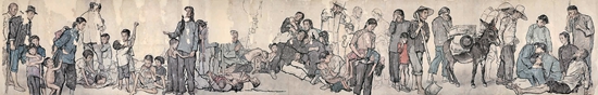 展廳中尺幅巨大的《流民圖》,以宏大的體量感和群像雕塑般的造型性依舊感染著無數觀者。繼1959年在當時的中國革命博物館和中國歷史博物館與觀眾見面後,《流民圖》又一次展現在這裏,這也是自1998年《流民圖》捐獻給中國美術館以來的首次“出門”展出。對于《流民圖》,中國文聯副主席、中國美協主席劉大為回憶道:“第一次看到它,是在中國歷史博物館的地下室,後來則是在中國美術館,蔣兆和立志于用藝術表現人民大眾,始終關注人民大眾的精神,每次看他的作品都會有所收獲。《流民圖》代表著一個時代的藝術成就,而其作者蔣兆和則展現著一位藝術家卓然于時代的‘不盡丹心’。”