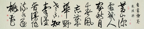 每當觀者將李仲元的詩和書有機地融為一體去品味時,就會發現其中蘊含著的正是中國獨特的文化精神——“和”。有人求美不當,過分依賴于媚,南轅北轍,恰得其反;李仲元的作品則以力求美,筆筆健勁有力,氣魄自然而然地顯現出來。其書作,提按分明有致,于是輕重、枯潤、濃淡、伸縮的變化隨之而出,虛與實的辯證關係也就合理地體現出來,具斬釘截鐵之氣勢,筆觸跳躍不羈,忽而細若發絲,忽而重比刀戟,但卻始終不離不棄“力”字,而更難得的是,其在體現“力”的同時亦不忘“美”字,二者于作品中自然融合,最終呈現出“芳林花雨、藝徑通幽”之獨特藝術美感。