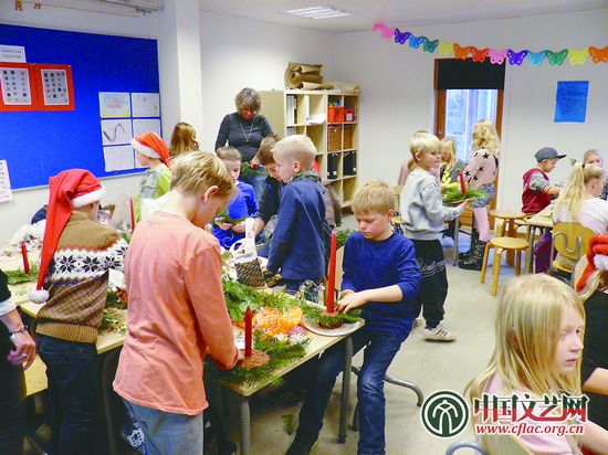 為了進一步了解丹麥的聖誕傳統,筆者12月1日還探訪了Kvikmarkens Privatskole。這是個私立學校,共有近400個學生。如同丹麥其他學校一樣,全校師生每逢12月1日都會參加全天聖誕裝飾活動,除了使校舍增加節日氣氛,也是讓學生練習剪裁和粘貼的機會。學校事先制定了全天計劃,備好了各種材料。筆者主要參觀了一至三年級的活動,一進“作坊”的門便傳來了聖誕樂曲,教室的地上放著不少松樹枝、松塔,桌上還有大塊的裝飾用泥、紙盤、彩紙彩帶、橘子和蘋果,要用自取。