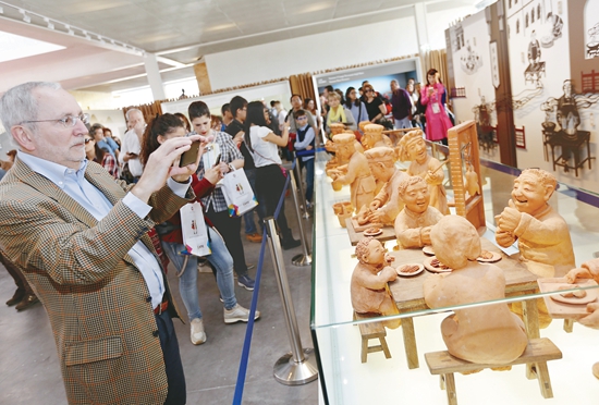 5月2日,在意大利米蘭世博會中國館,一名遊客拍攝介紹老北京烤鴨的民俗泥人。米蘭世博會中國館是中式風格與現代設計的完美結合,受到參觀者的廣泛關注。新華社記者 葉平凡攝