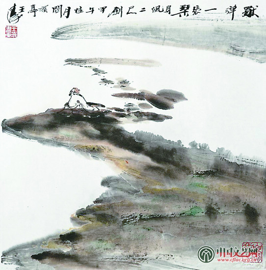 濃濃的自然崇拜。王濤大量描繪了古典的山水人物,但是,卻充滿了濃厚的時代感,帶有強烈的時代警示性。他的山水草木,撩撥起人類原始的本性追求,點燃了人類自然崇拜的神聖感。他用一副副純真、唯美的意境告訴人們,自然是如此之美,置身自然之中是如此高端的精神享受。他筆下的山水,都是古典的、原生態的,配以古典的人物,從而塑造了古典的意境,抒發了古典的情懷,表達了古典的哲學觀。他的畫在一遍遍地告訴人們:大自然,是人類的精神園林。《逍遙遊》用最簡潔的筆墨,勾勒出最高遠的山水意境,《獨彈一琴》也是用簡約的幾筆橫向涂抹,便畫出“天高水遠間,人鳥蹤不見。豈為誰人賞,一琴我獨彈”的意境,高遠豪邁。《垂釣》圖中“釣罷歸來不係船,江村月落正堪眠。縱然一夜風吹去,只在蘆花淺水邊”,淋漓地表達了畫中人物置身自然的灑脫,築起了超逸悠遠的精神園林。