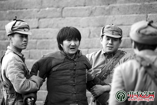 為了突出同一事件在三個段落中的循環往復,影片有意識地淡化了人物形象的文學性描寫,把原本應該由劇情承擔的表情達意功能轉移到視聽形象、造型意識等其他藝術層面。狗剩離家十年從少林寺歸來的一場戲裏,楊三起哄讓狗剩當眾打一路拳,當狗剩逆光站到天窗前化成一條黑影時,電影的縱深感瞬間消失,黑白影像因為光影對比變成了扁平的漫畫式速寫,而穿插其間的眾人看拳的反應則有意使用了寫實的固定鏡頭。這種二次元與三次元的切換式拼貼,首先強化了狗剩武功是強是弱的懸念,而當不會武功這個事實公之于眾後,又強化了這一場面的喜劇效果。