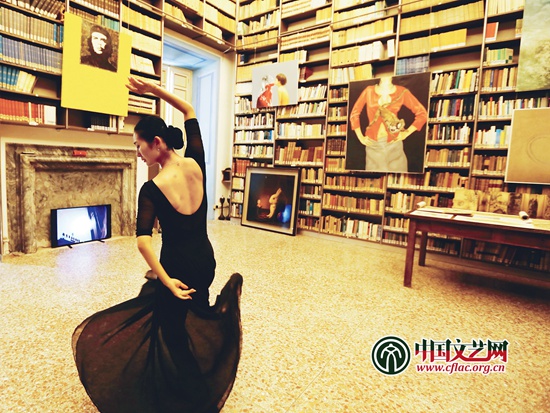 6月17日,在意大利羅馬,一名舞者在布滿畫作的展廳中翩翩起舞。