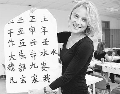孔子學院有力推動了中國文化與各國文化的交流。圖為美國普渡大學孔子學院和丹麥哥本哈根商學院師生來到上海交通大學進行文化交流,並展示自己的漢語書法習作。