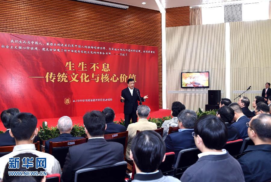 4月23日,在第20個“世界讀書日”到來之際,中共中央政治局常委、中央書記處書記劉雲山來到中華書局,參加讀者開放日活動。這是劉雲山來到“生生不息——傳統文化與核心價值”誦讀現場,同大家一起重溫中華經典名句。 新華社記者饒愛民攝