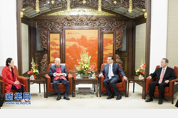 4月27日,國務院總理李克強在北京中南海紫光閣會見中央文史研究館館員、香港大學榮休教授饒宗頤先生(左二)。 新華社記者黃敬文攝