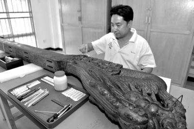 在中和韶樂文物修復工作室,記者看到,工作人員正在對一套清中期的編鐘進行修繕,包括底座、獅子、柱子、橫梁、鳳鳥等14個構件。在對3米多長的金絲楠木橫梁進行清污時,工作人員使用的工具竟是一支“小棉簽”,一寸寸地清理。據介紹,這根金絲楠木橫梁僅清污一步,就要耗時兩周以上,甚至更長時間。“清污只是第一步,接下來還要對起翹、空鼓的漆皮進行加固回貼,對缺失構件補配。”工作人員表示,在人力、設備等配備都很理想的狀態下,完成這套編鐘的修繕至少需要6~8個月。