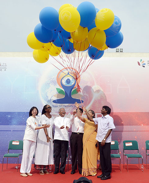 在當日舉行的首個國際瑜伽日啟動儀式上,印度駐華大使康特(AshokK.Kantha),北京大學副校長李岩松以及生活的藝術基金會中國區負責人勤豐發表演講。余勤豐在中英雙語的演講中表示,瑜伽已經成為解壓、健康、快樂、以及創意的代名詞,今天全世界都充分認識到這項改善生命質量的技巧的重要性。同時她對此次活動中無私付出的義工們表示敬意。