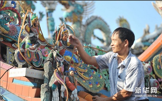 孫麗強在福建東山縣的一座廟宇屋頂介紹他翻新的剪瓷雕人物造型