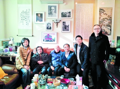 徐重慶先生(左二)與湖州市文廣新局局長宋捷(左四)等看望趙景心先生(左三)。供圖:湖州市文廣新局