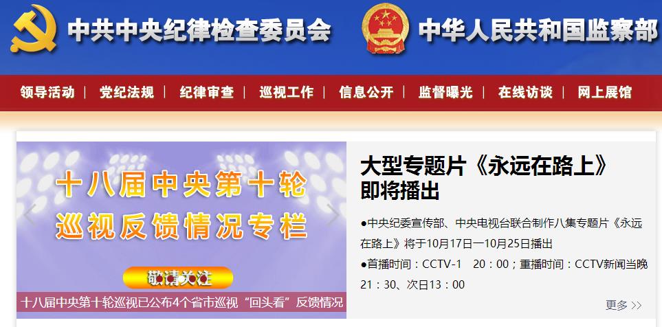 人民網北京10月12日電 據 中央紀委監察部網站消息,中央紀委宣傳部、中央電視臺聯合制作的八集專題片《永遠在路上》將于10月17日一10月25日播出。據專題片的預告片介紹:十八大以來,從嚴治黨、正風反腐,力度有目共睹。黨中央把管黨治黨提到前所未有的新高度。黨的十八屆六中全會將對全面從嚴治黨做出戰略部署。近四年來,黨中央著力構建不敢腐、不能腐、不想腐體制機制,反腐敗壓倒性態勢正在形成。多位因嚴重貪腐、違紀違法而落馬的省部級以上官員首次講述他們的懺悔和反思。