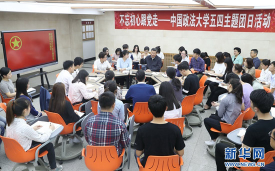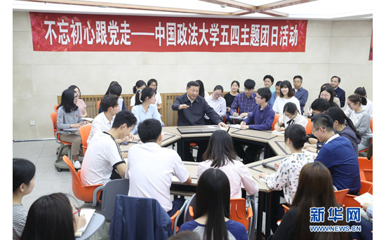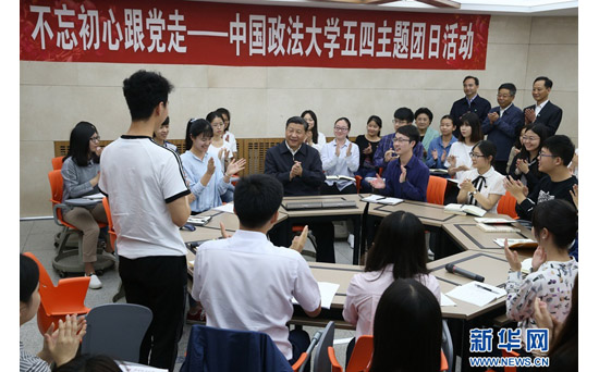 5月3日,中共中央總書記、國家主席、中央軍委主席習近平來到中國政法大學考察。這是習近平在學生活動中心參加民商經濟法學院本科二年級2班團支部開展的“不忘初心跟黨走”主題團日活動。新華社記者 王曄 攝