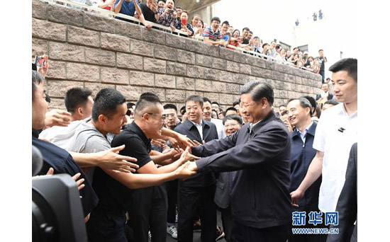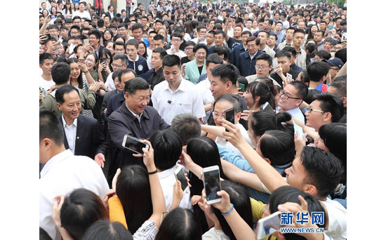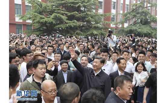 考察結束時正值下課時間,聞訊而來的師生們站滿校園道路兩旁,習近平沿路同師生們熱情握手,向遠處的師生們揮手致意。熱烈的掌聲和歡呼聲經久不息,蕩漾整個校園。