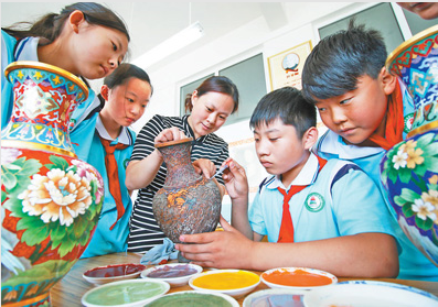 3日,河北大廠回族自治縣的孩子們正在體驗國家級非遺景泰藍制作中的“點藍”技藝。