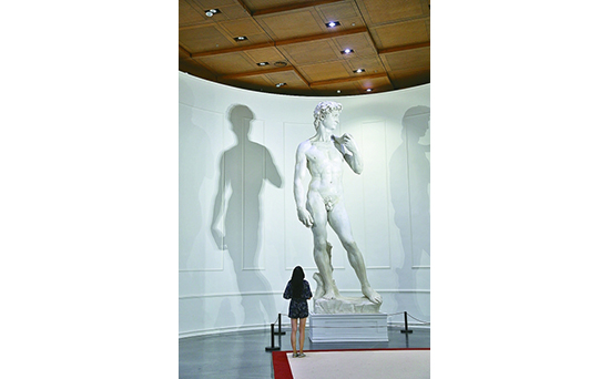 過了一會兒,他給記者發來微信:“我剛才説錯了,看到後面感覺太好了。”展廳往裏走,可以看到米開朗基羅《創世紀》濕壁畫的臨摹作品、古紙復制素描,以及《聖殤》《酒神》等翻模雕塑,其中尤為醒目的《大衛》雕像為世界上僅存三件之一的1:1原模復刻。這位學了三年雕塑專業的大學生説:“近距離觀察,能看清線條的作用、素描的節奏,看清雕塑上的起伏和深度,這是靠圖片或講解體會不到的。我覺得原作也好,復制品也好,其根本價值在于內容,不必太過糾結于形式。”