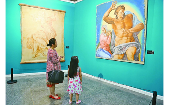 8月20日,正在鳥巢文化中心展覽的“米開朗基羅國際藝術展”展廳裏,人們在靜靜觀賞。被譽為“文藝復興三傑”之一的大師有著不言自明的號召力,吸引來不少觀眾,有三五成群的年輕人、結伴而來的情侶,也有帶著孩子的父母。