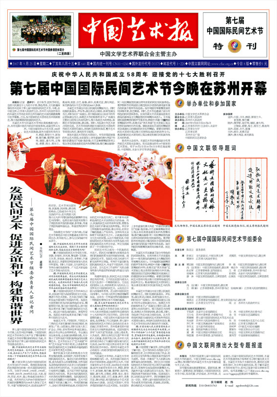 《中國藝術報》第七屆中國國際民間藝術節特刊9月25日正式推出。這期特刊共四版,刊登了對本節藝術節組委會負責人的專訪、領導題詞、藝術節的有關資料和參演外國團體的簡介。