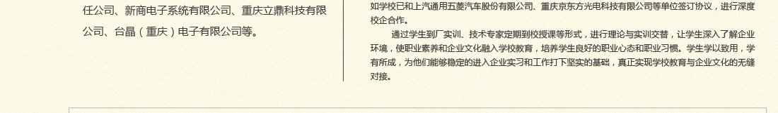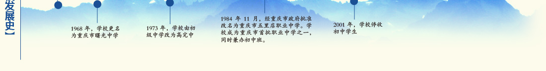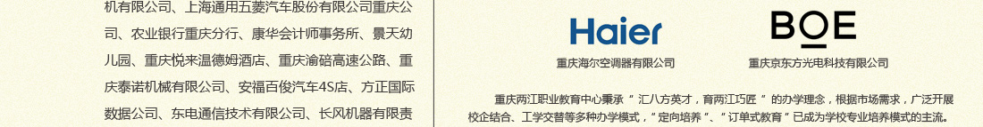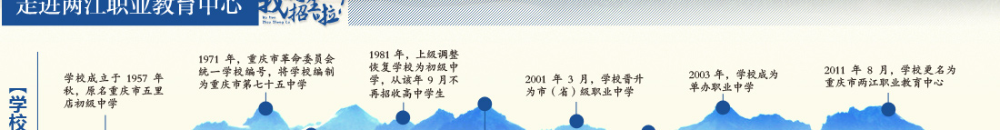 重慶市兩江職業教育中心,擁有五十多年的辦學歷史。原為重慶市曙光中學,又名七十五中。1984年11月改辦職業教育,更名為重慶市五裏店職業中學,是重慶市首批省市級重點中職學校之一。重慶市“兩江新區”正式挂牌成立不久,政府就于2011年8月,批準學校更名為重慶市兩江職業教育中心。區委區府投入6千多萬元完成了學校的改擴建工程,學校的硬件設施和辦學實力得以大幅提升,成為坐擁“重慶市兩江新區”發展資源的職教高地…【詳細】