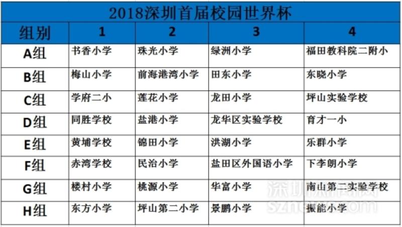 據主辦方透露,本次活動共籌備了2個多月時間,接到報名學校上百所,通過溝通和篩選,經組委會研究決定,選擇組別為小學(男子)組3、4年級學生組隊參賽,來自深圳市各個區的32所學校最終挺進“世界杯”。同時,比賽將採用世界杯賽制,32支參賽隊以抽簽形式進入ABCDEFGH共8個小組進行小組賽,小組積分榜前兩名的球隊晉級出線。淘汰賽階段,出線隊伍將進行單回合淘汰最終決出校園世界杯冠軍。