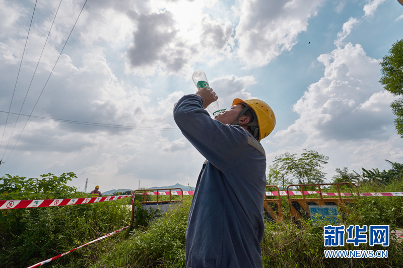 高溫下急需補充水分的電力工人。新華網發(高科 攝)