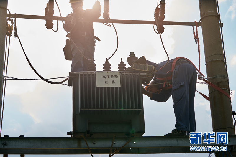 施工人員固定變壓器和安全繩,確保作業安全。新華網發(高科 攝)