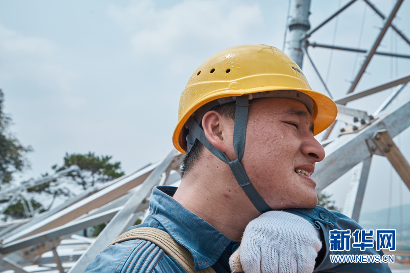 施工人員在鐵塔上揮汗如雨。新華網發(高科 攝)