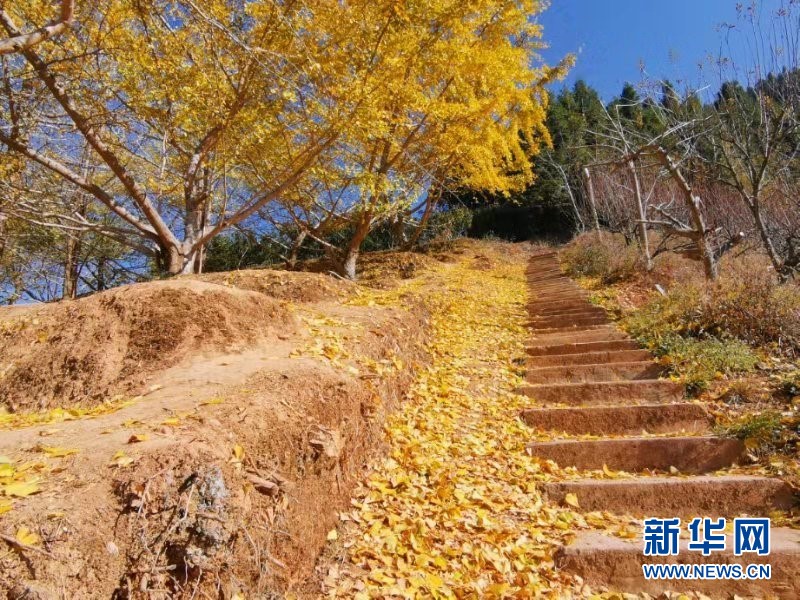 一棵棵銀杏樹為這裏鋪上了一層暖色調,與初冬的藍天和暖陽融合在一起,形成了一幅獨特醉人的山間美景。新華網發 王衛攝