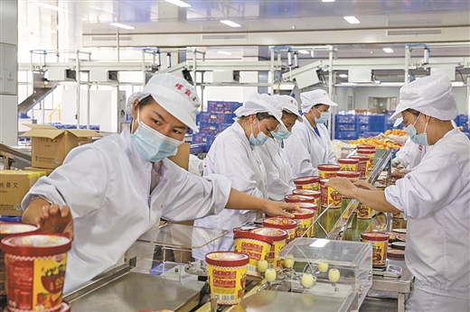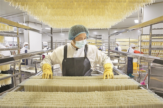 在柳州市一家預包裝柳州螺螄粉企業,工人們正在生産螺螄粉。