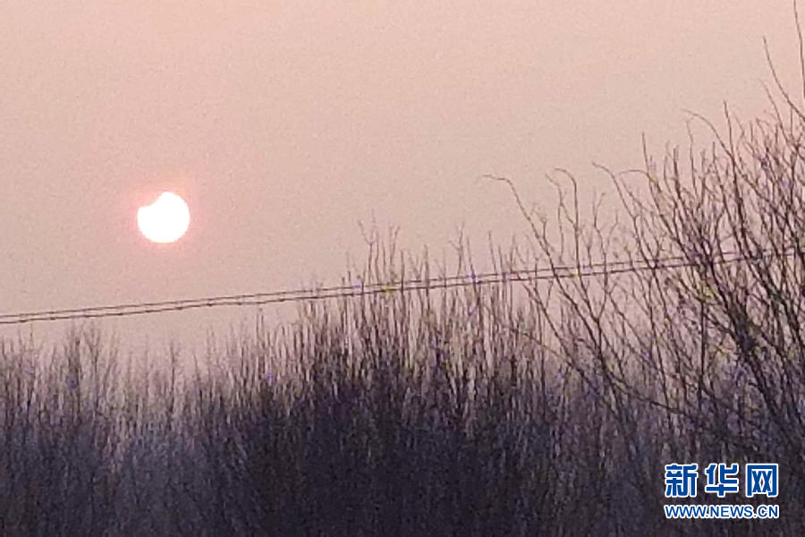 與日全食相比,日偏食發生時天色沒有全黑,觀測條件比較有利,別有一番景致。圖為河北邢臺市內丘縣出現的日偏食。新華網發 焦立雲攝