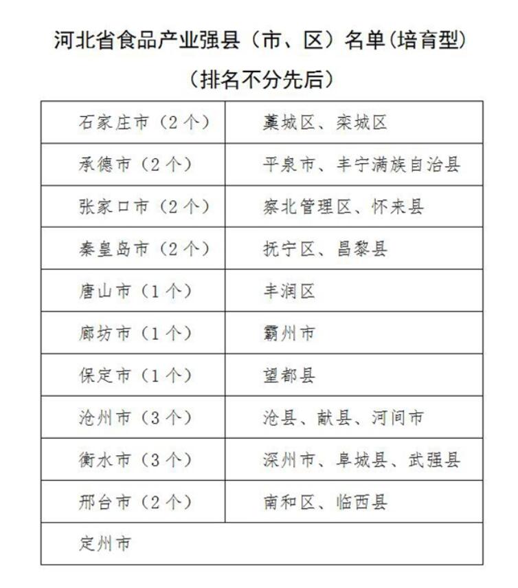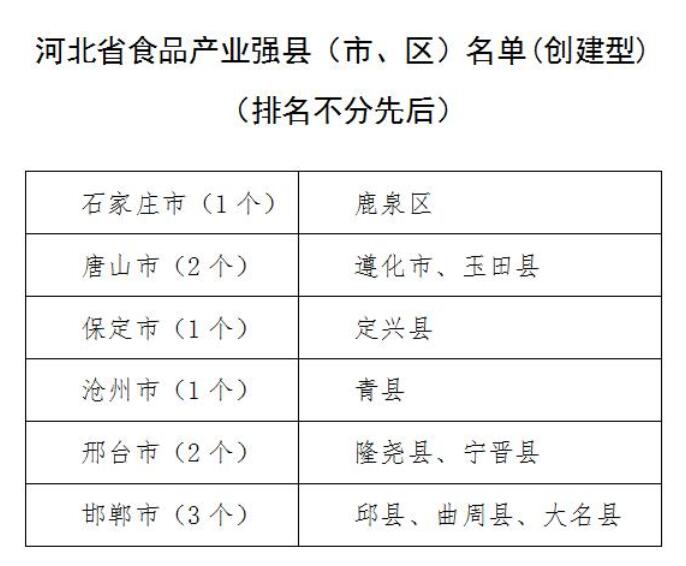 經自願申請、各市人民政府推薦、組織專家評審及現場答辯、專題會議研究審定,河北省工業和信息化廳日前發布《河北省食品産業強縣(市、區)名單》公示,全省共30個縣(區)入選,其中創建型名單10個,培育型名單20個。