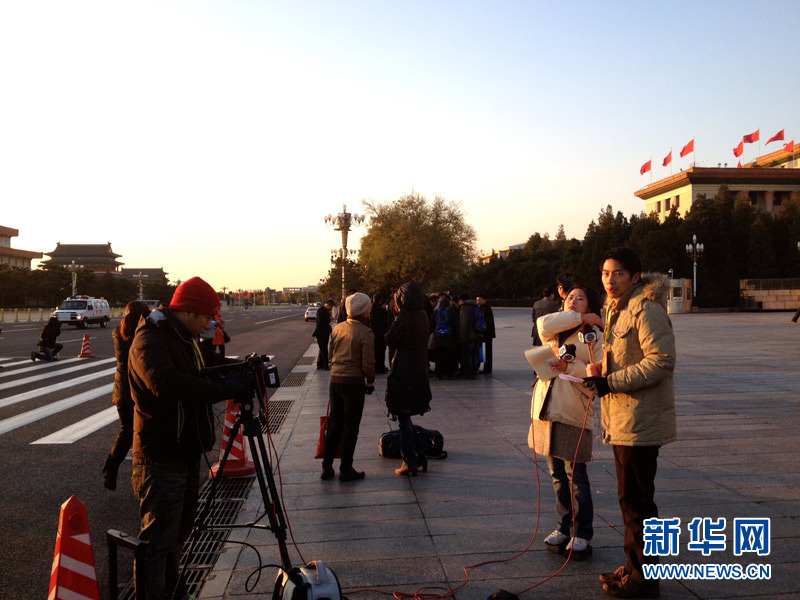 中國共産黨第十八次全國代表大會閉幕會11月14日上午在人民大會堂舉行。圖為記者早早趕到人民大會堂外做報道的準備工作。新華網 溫馨 攝